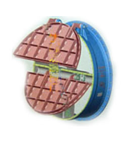 拍門適用于給排水及污水處置工程的各種管道和水渠道作溢流、止回之用,亦可用作各種豎井井蓋,它僅用于單向水流的圓形出水口構(gòu)造特性,拍門具有流道正向單向開啟和反向關(guān)閉的作用。配重式拍門借助于配重的均衡作用,在水流的作用下使門頁自動(dòng)開啟或關(guān)閉,或稍加外力作用使門頁開啟或關(guān)閉;浮箱式拍門則應(yīng)用門頁在水中的浮力,在水流的作用下使門頁開啟或關(guān)閉。